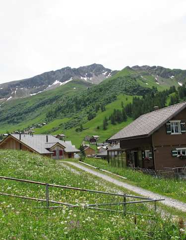 Vom Parkplatz in Vnà durch das Dorf und nach rechts auf breitem Alpweg zu einer Abzweigung. Die weite Kehre durch den Wald schneidet man auf einem Fußweg ab, der über eine sumpfige Wiese – Palü Lunga – zur Alp Discholas führt.