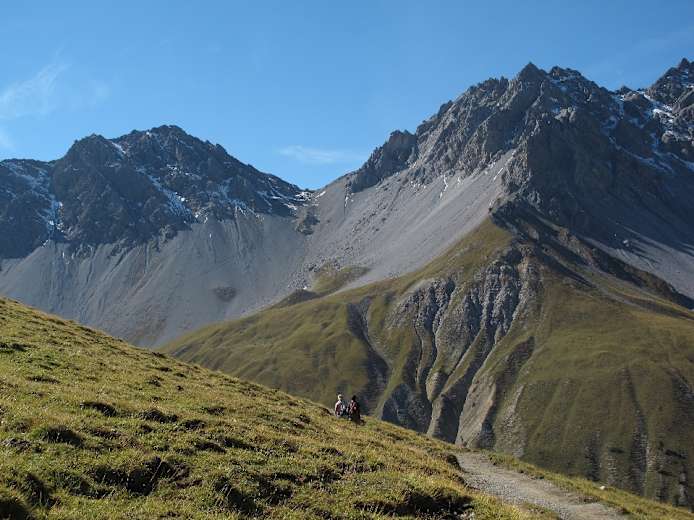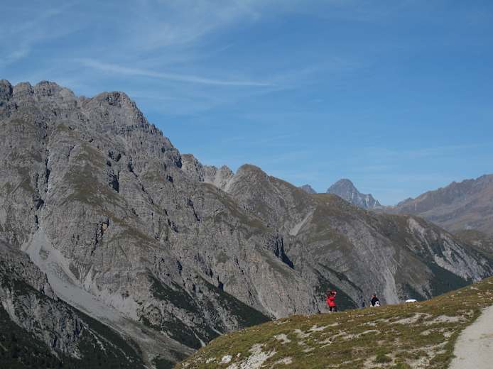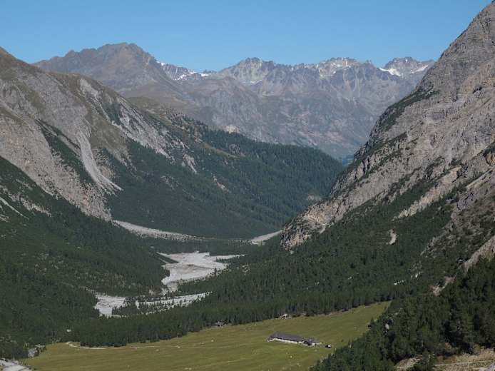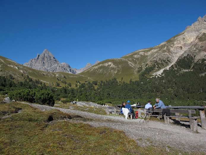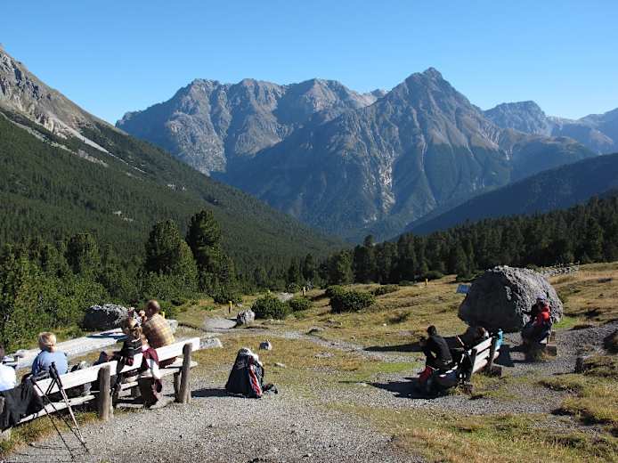 Sehr schön ist auch der Blick auf den Piz Sesvenna und die Dreitausender rund um S-charl. Beim Abstieg verlassen wir den Nationalpark. Unser Weg führt über die Alp Plavna in den Talboden. Der Weg zieht sich nun ganz gehörig (Abwechslung bietet eine Feuerstelle mit Spielmöglichkeiten) bis man über Resgia Plavna den „Parkplatz Val Plavna“ am Ausgang des Tales und wenig später Fontana erreicht. Durch den reizvollen Ort (mit herrlichem Blick zum Schloss Tarasp) in wenigen Minuten zur Haltestelle des Post-Autos.
