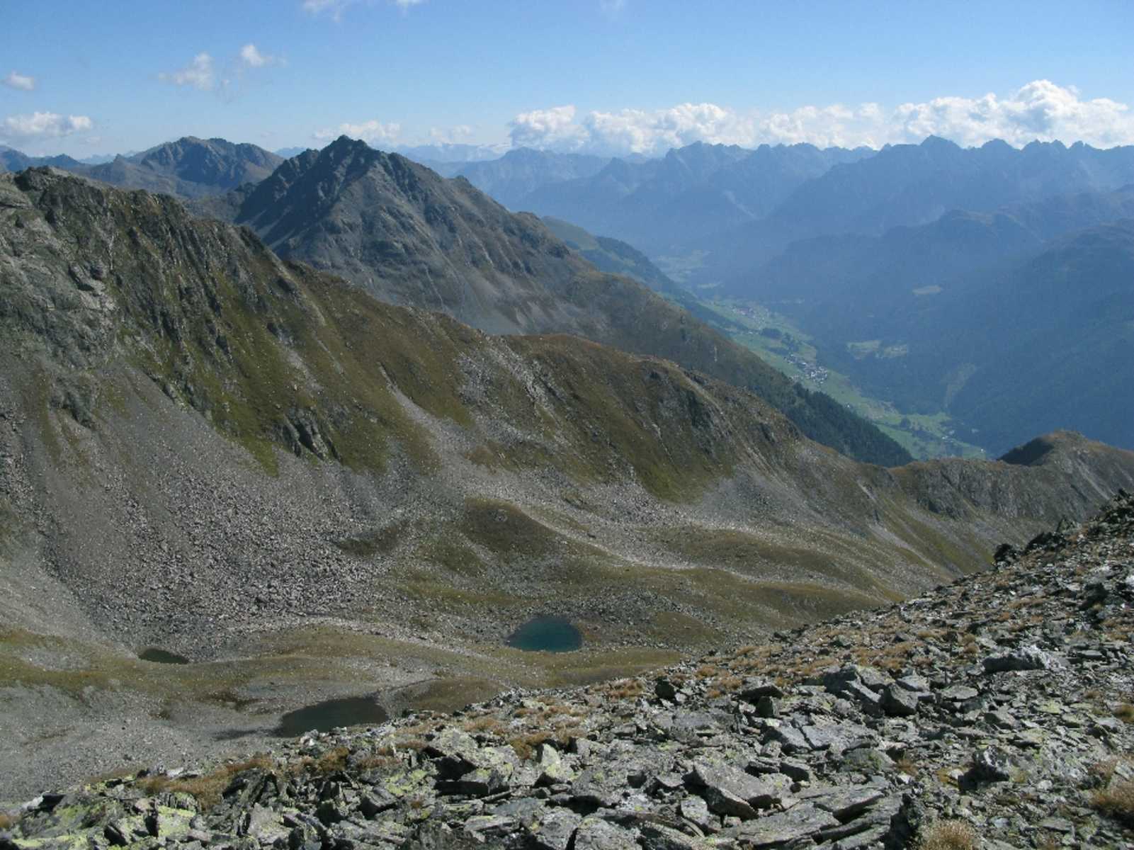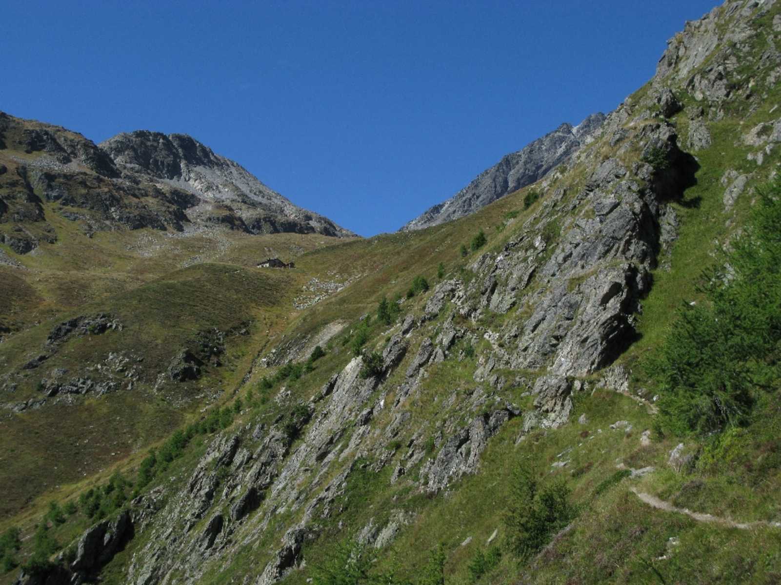 Zurück in die Scharte. Man quert ein Kar zu einem Rücken, über den man absteigt. Nach rechts abbiegen und in der steilen Westflanke des Piz Linard in die Val Sagliains absteigen.
