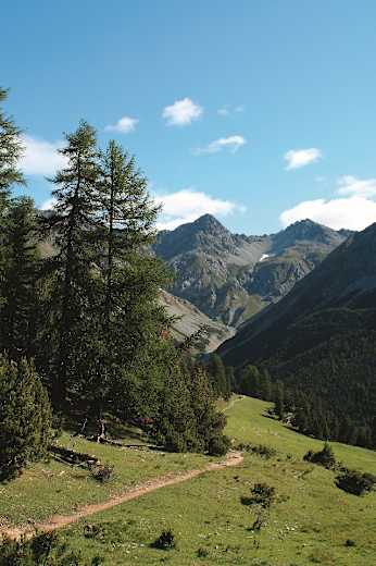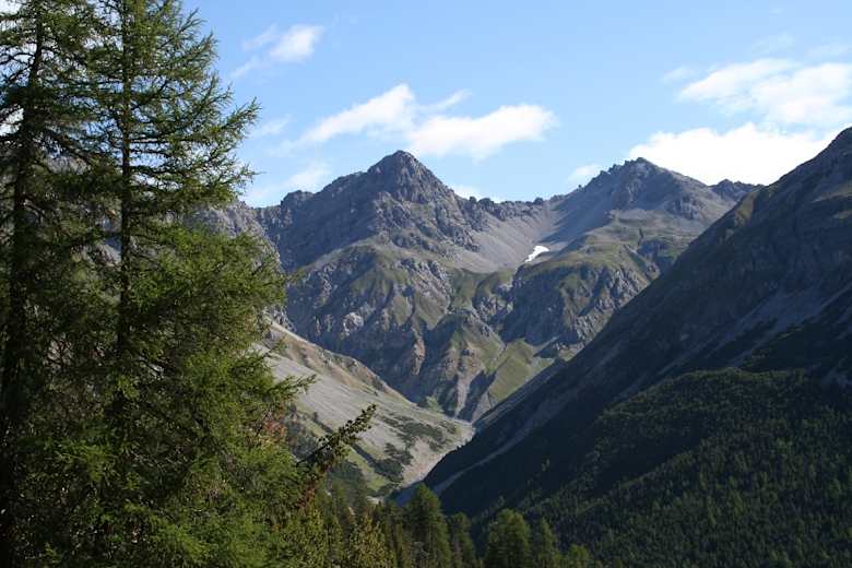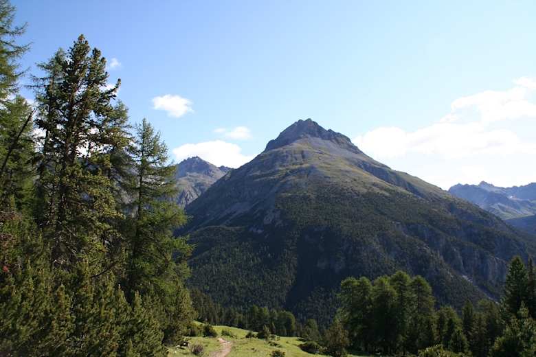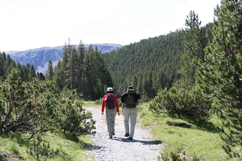 Vom Parkplatz dem Wegweiser folgend in den Wald. Erst etwas steiler, dann aber recht gemütlich und mit geringem Höhengewinn zu einer Wegverzweigung. Geradeaus käme man nach Il Fuorn (Einkehrmöglichkeit). Wir halten uns rechts und erreichen durch den Wald eine Lichtung: Das ist unser Ziel, die Alp Grimmels – schöner Blick auf einige Nationalpark-Gipfel und über Il Fuorn hinaus bis zum Ofenpass, große Murmeltierkolonie!