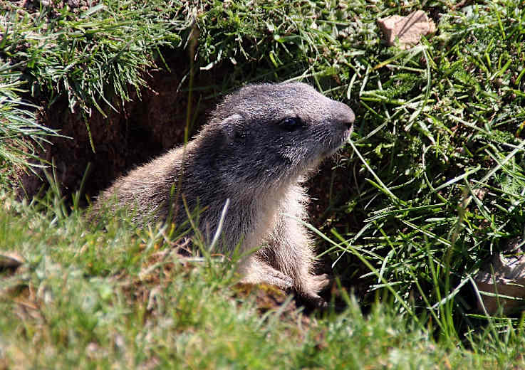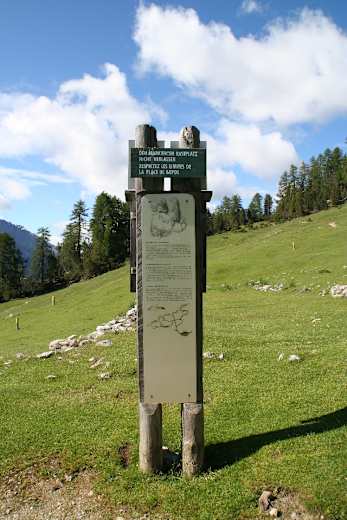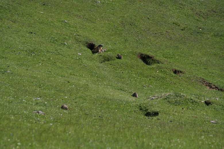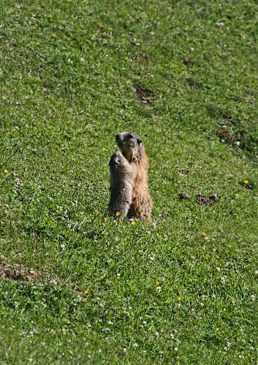 Auf dem mit gelben Pflöcken markierten Rastplatz finden wir eine Tafel, die uns über das Leben der Murmeltiere informiert – und recht häufig auch diese possierlichen Tiere selbst, im Frühsommer mit Jungtieren. Frühaufsteher sind – wie auch bei der Beobachtung anderer Wildtiere – im Vorteil. Die Wanderung ist bereits für einigermaßen gehfreudige 3- bis 4-jährige Kinder geeignet, die bei der Beobachtung der Murmeltiere begeistert sein werden.