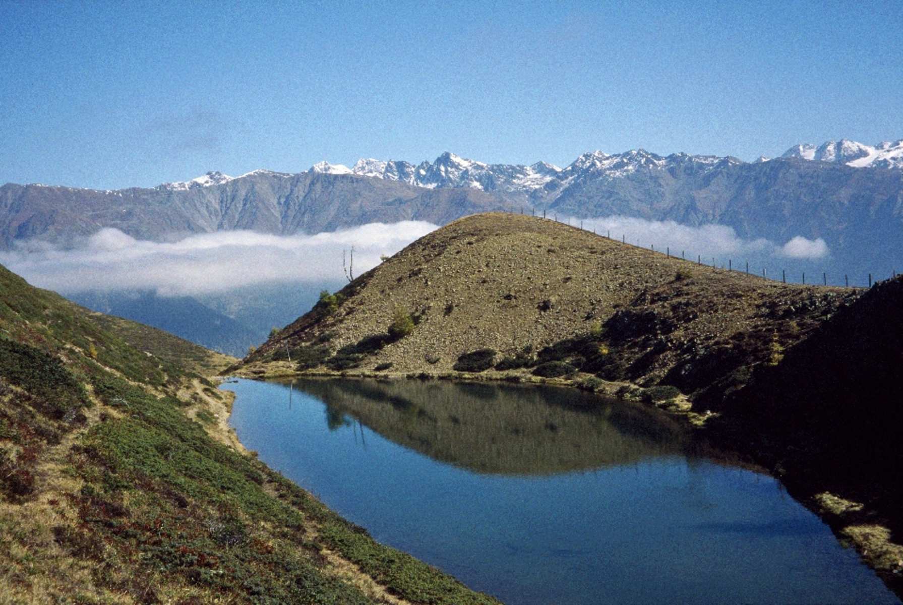 Unser Weg führt am Südufer des Pfaffensees entlang, gleich unterhalb ein zweiter kleiner See, der sehr idyllisch in einer Senke liegt. Man wandert vom Ufer des großen Sees über weite Hänge (Nr. 4a) aufwärts zum Rücken des Schafbergs, 2.411 m. Dieser bildet eine sanfte Kuppe im langen Nordostrücken des Watles.