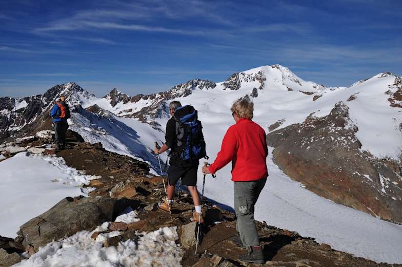 Auf einen „Familien-Dreitausender“ mit grandioser Gipfelschau im Südtiroler Vinschgau: Hat man erst einmal den Weg zur „Schönen Aussicht“ geschafft, kann die Wanderung auf das „Hintere Eis“ (3.269 m) in den Ötztaler Alpen für einigermaßen geübte Geher zu einem einmaligen Erlebnis werden. Der Weg führt über die Block und Schutthänge mäßig steil bergan, durchgehend mit teils großen Steinmännern und Farbflecken markiert.