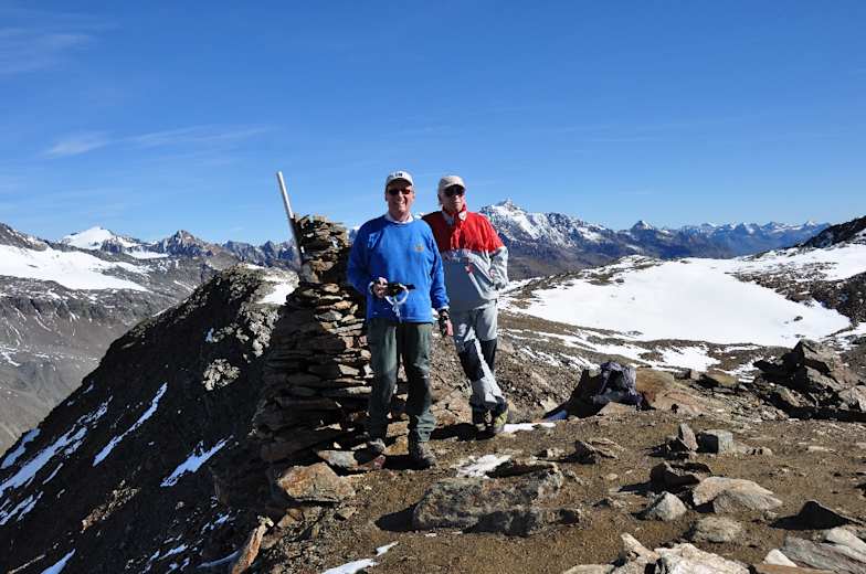 Vom Gipfel bietet sich eine umfassende Rundsicht an, die kleine Gipfelerhebung „Hinteres Eis“ steht frei über dem großen Hintereisgletscher im Norden und dem Hochjochferner im Süden.