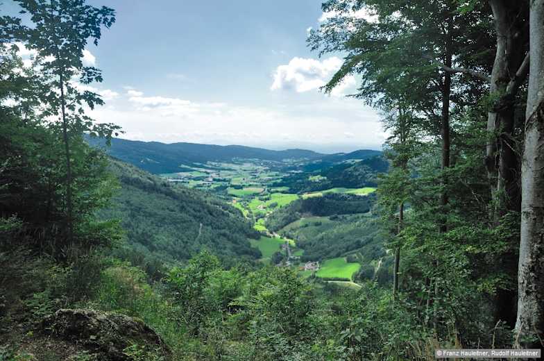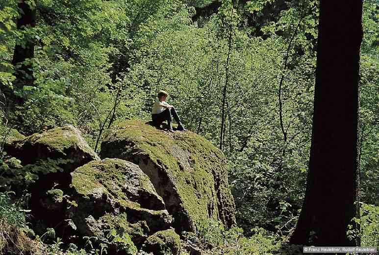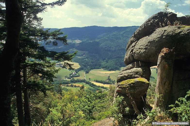 Von der Felsgruppe (Durchschulupfstein, Schalenstein) hat man einen guten Blick ins Yspertal.Foto: Franz Hauleitner, Rudolf Hauleitner, Rother Bergverlag