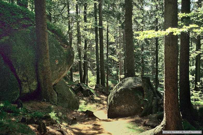 Hier geht es auf Weg Nr. 31a schließlich weiter zu einem Felsportal und links davon steil abwärts hinunter in den von Granitblöcken durchsetzten Wald.Foto: Franz Hauleitner, Rudolf Hauleitner, Rother Bergverlag