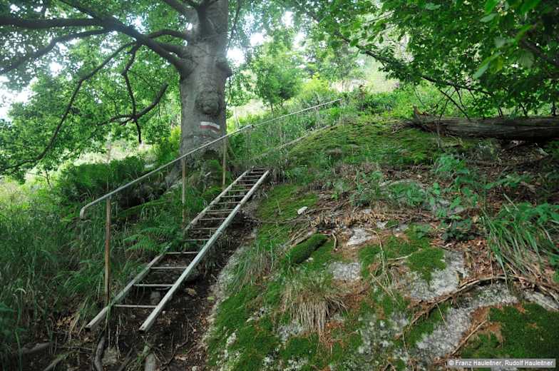 Auf Weg Nr. 31a zu einem Felsportal und links davon über eine Felsplatte (Geländersicherung) steil abwärts, danach an zwei geneigten Eisenleitern hinunter in den von Granitblöcken durchsetzten Wald. An der steilen Flanke in Ostrichtung abwärts, später nach rechts (Südwesten) hinunter zu einem Karrenweg. Diesen im Wald nun weniger steil bergab, später über Wiesen und Felder zu einer Wegkreuzung vor dem Ort Pisching. Rechts, auf dem teilweise asphaltierten Güterweg Nr. 31, an den Weilern Pichl und Wim vorbei, nach Humpellehen und wieder zurück zum Ghf. Forellenhof.