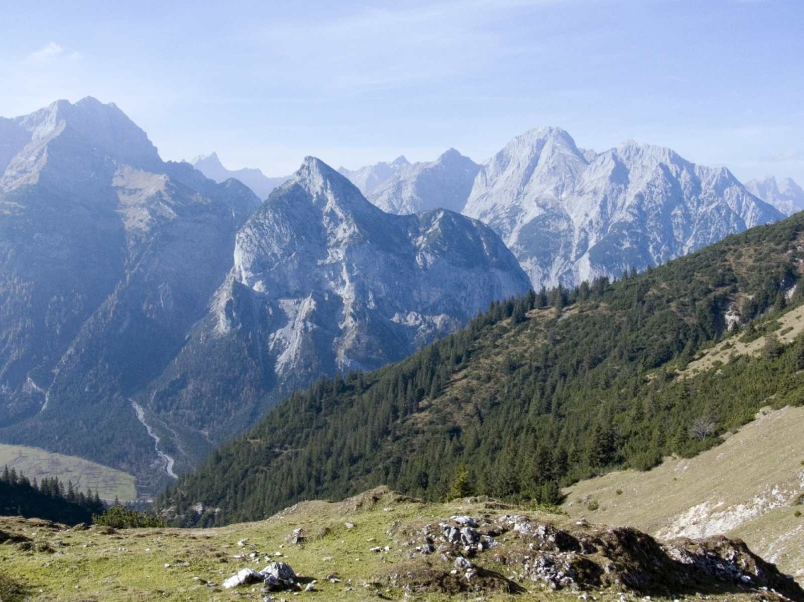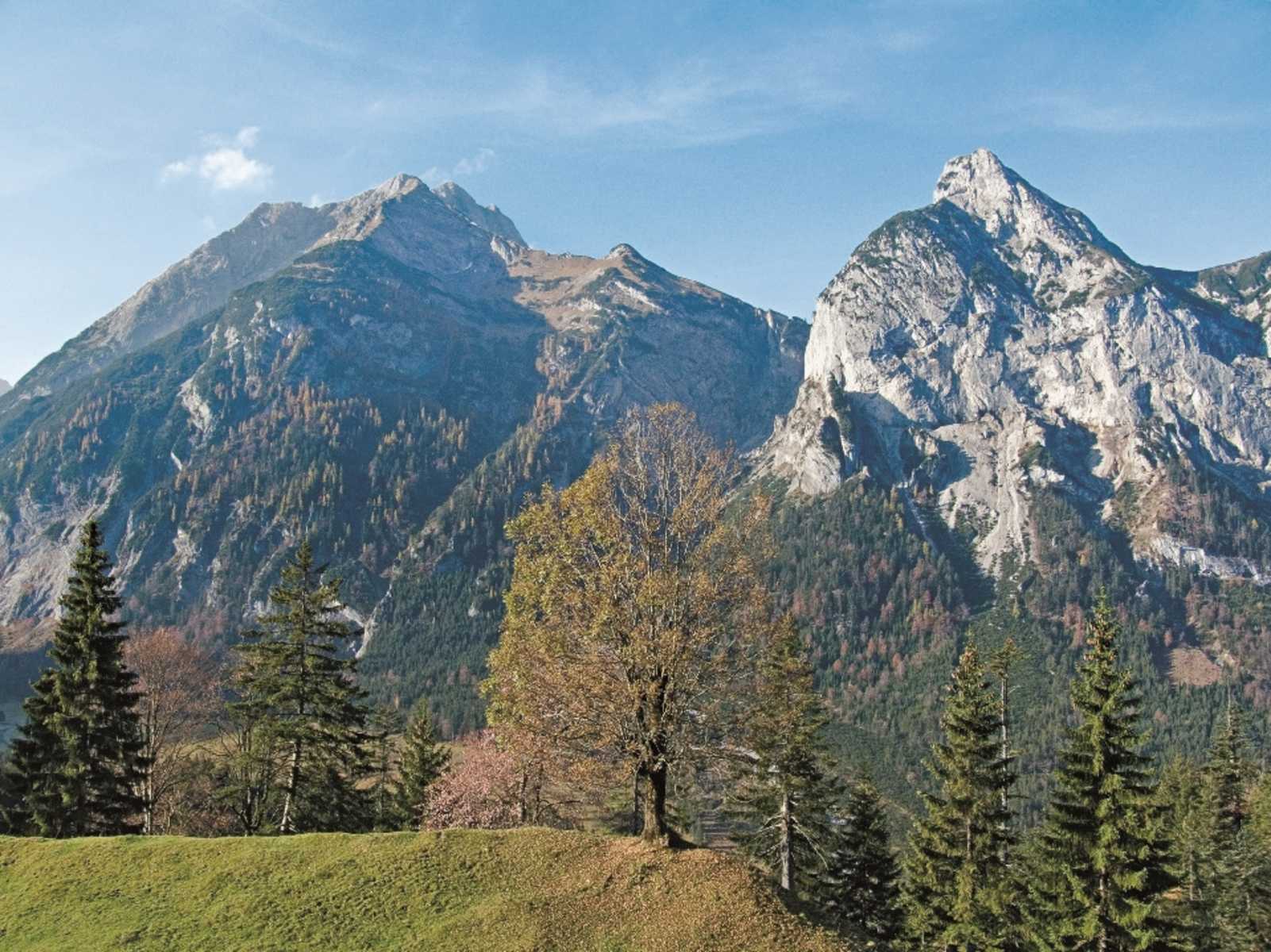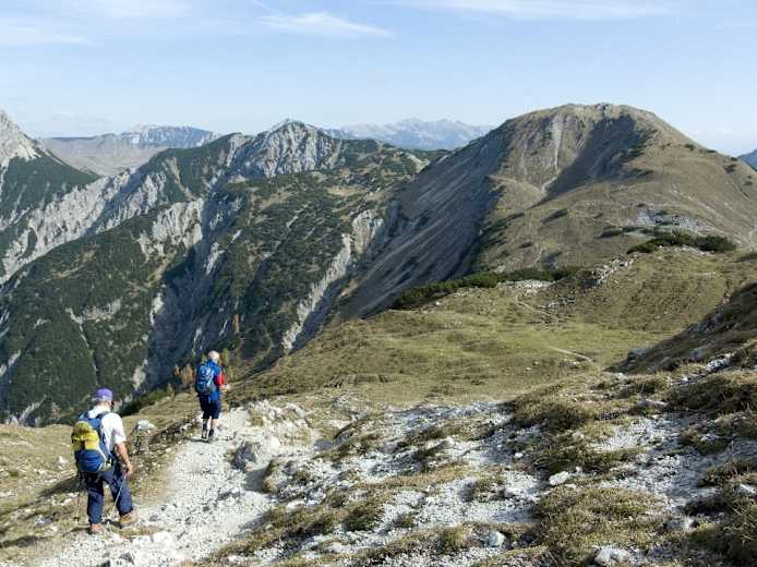 Sonnenseitige Wanderung in Tirol im Schatten markanter Karwendelriesen: Diese aussichtsreiche Bergwanderung, bei der sich eine ausgedehnte Rundtour anbietet, verläuft auf überwiegend freien Südhängen der Ostalpen. Sie eignet sich also besser für kühle Tage oder den Herbst.