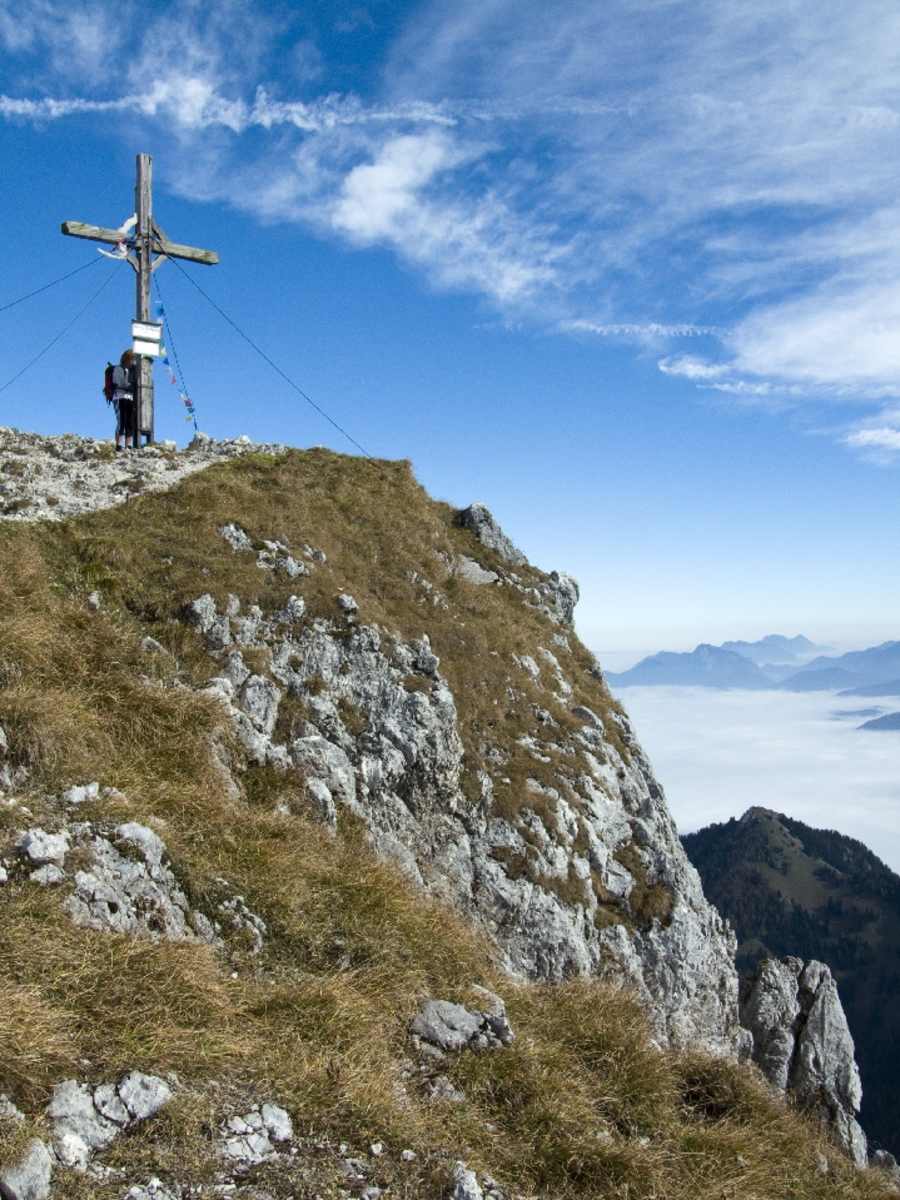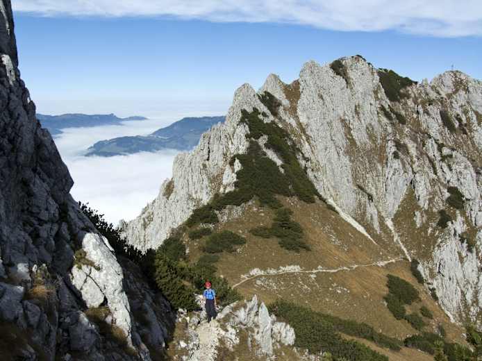 Zum höchsten Gipfel des Zahmen Kaisers: Die viel besuchte, aussichtsreiche Pyramidenspitze in Tirol, die auf langem Weg über die Vorderkaiserfeldenhütte gerne bestiegen wird oder auf dem steilen, aber nicht sehr schwierigen Klettersteig aus dem Winkelkar der nördlichen Ostalpen, ist der zweithöchste Gipfel des Zahmen Kaisers.