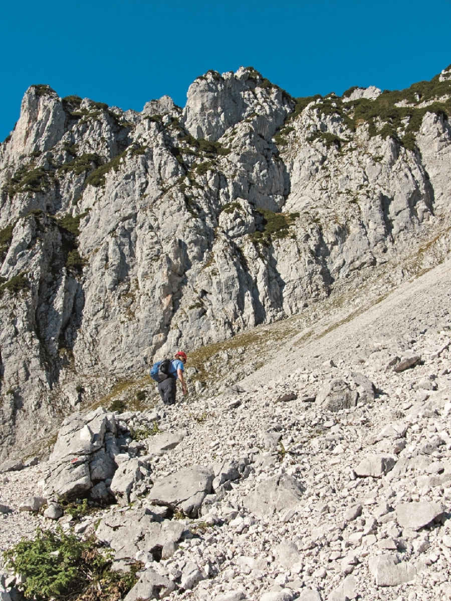 Dort quert sie – zwischendurch recht bequem – einen Wiesenhang, ehe sie wieder auf einen Schrofenrücken zu führt.