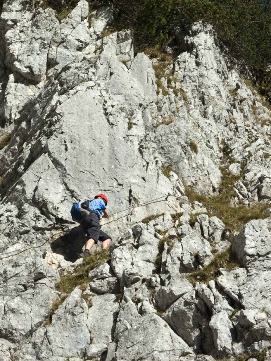 Dort wird die Tour ernst. Anfangs gehen wir über steiles Geröll auf die wilden Felsformationen unter den Jovenspitzen zu – nun kommen wir in Felsgelände hinein. Die deutliche Wegspur ist nun immer wieder mit stabilen Drahtseilen gesichert und schlängelt sich den steilen Hang hinauf, bis sie direkt unter der Jovenspitze links abdreht.