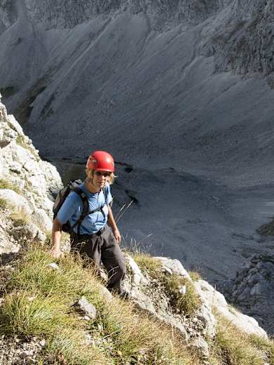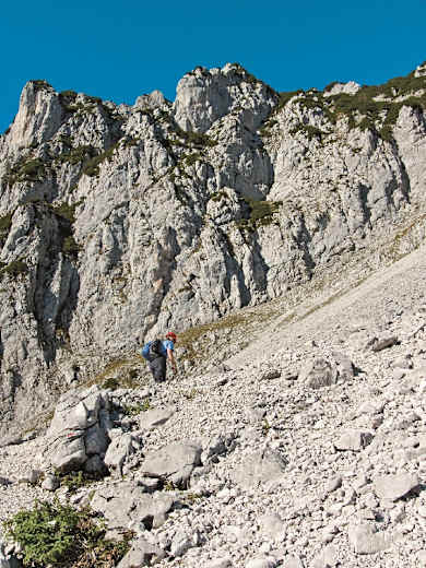 Über ihn steigen wir erst auf wechselnden Seiten auf, am oberen Rand des Scheiblingsteinkars vorbei und erreichen schließlich den letzten Gipfelaufschwung.
