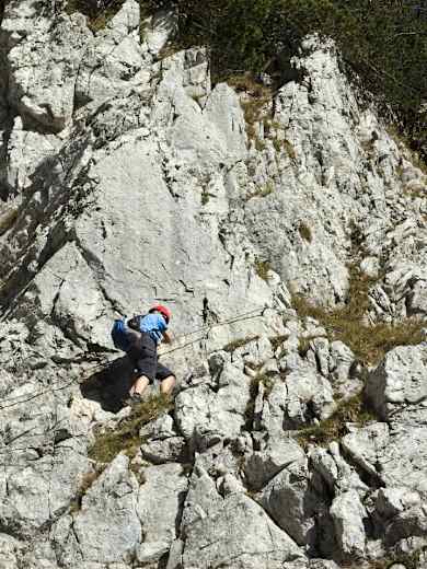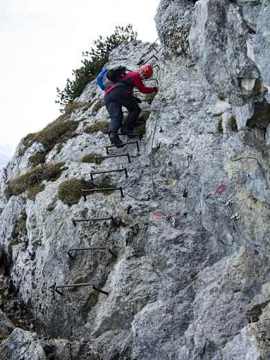 Dort werden wir von einer eindrucksvollen Krampenleiter erwartet. Sie führt fast senkrecht ein paar Meter hinauf und dann geht es noch kurz am Drahtseil entlang, bis die Pyramidenspitze erreicht ist.
