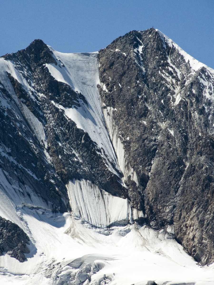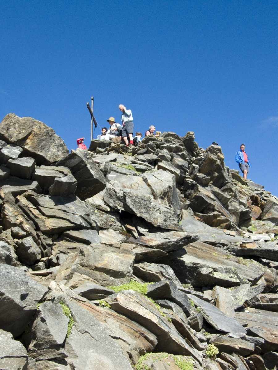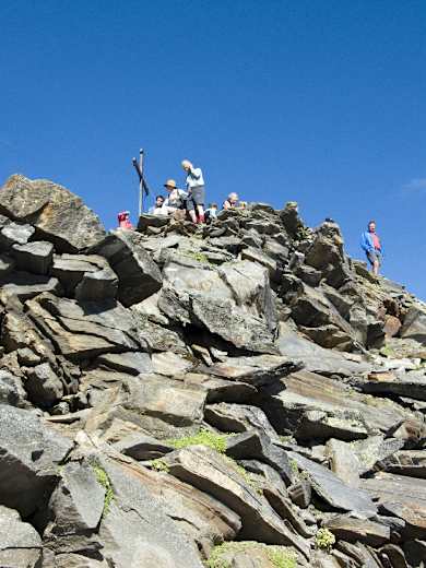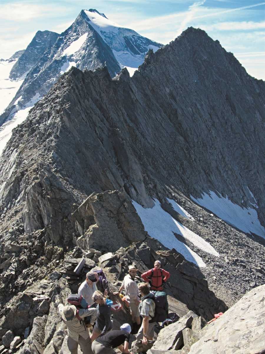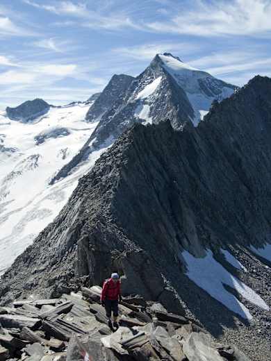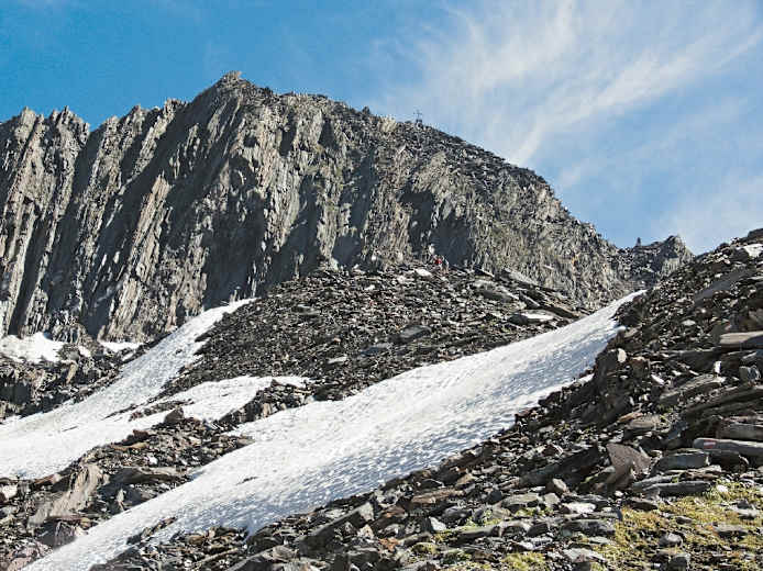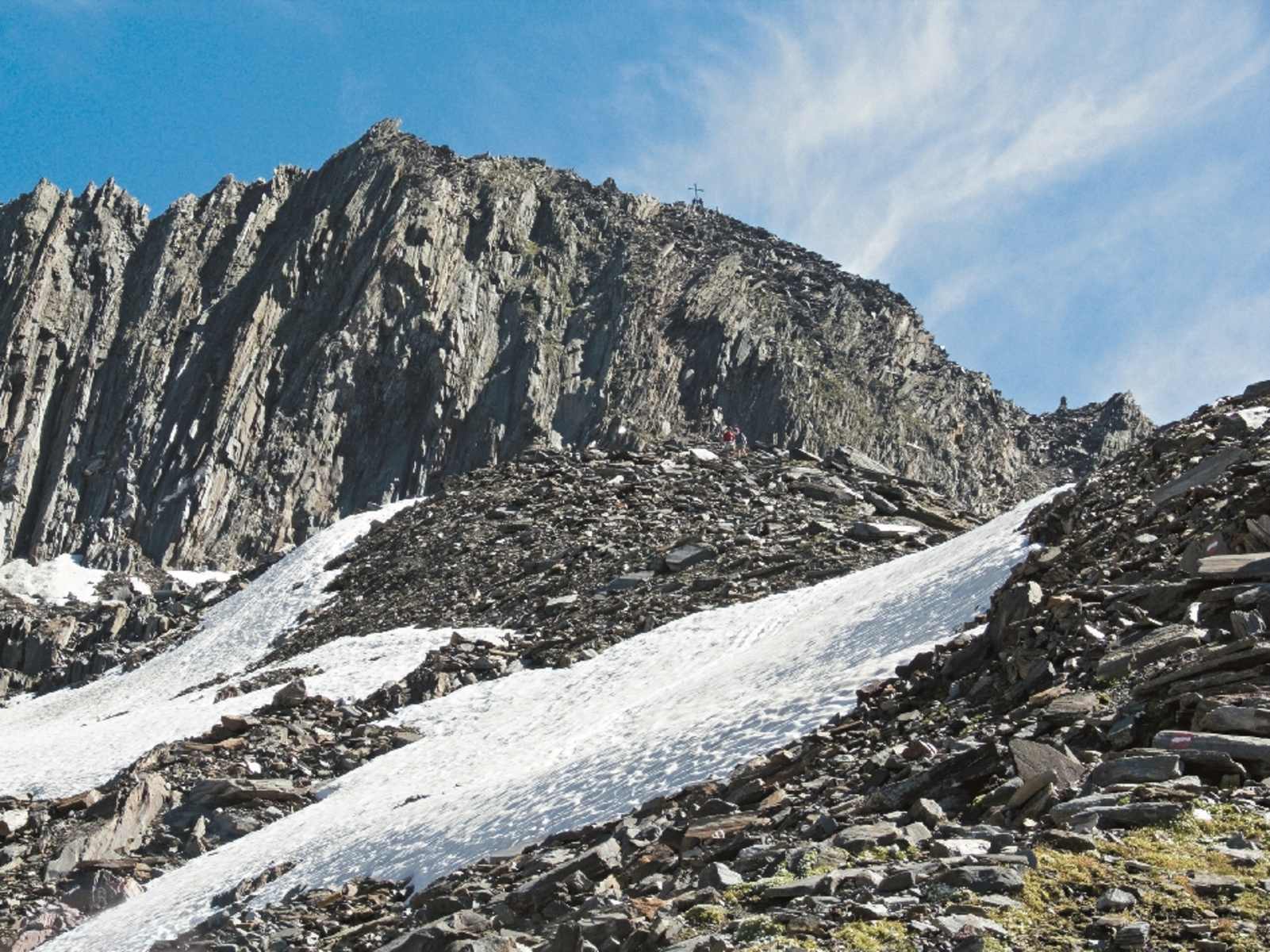 Die Vegetation wird karger, und die Schneefelder häufen sich. Ab 2.980 m kommen wir in grobes Schieferblockwerk hinein. Unter der Schönbichler Scharte erreichen wir schließlich ein Drahtseil, das sich mit dem Bergweg steil aufschwingt. Bei guten Verhältnissen wird man dieses Hilfsmittel kaum brauchen, bei Schneelage oder Vereisung kann es lebensrettend sein. Schließlich erreichen wir, empfangen von einer gewaltigen Gletscherschau, die kleine Schönbichler Scharte. Hier dreht der Anstieg links ab und führt in ein paar Minuten am luftigen Blockgrat zum Gipfelkreuz des Schönbichler Horns hinauf.