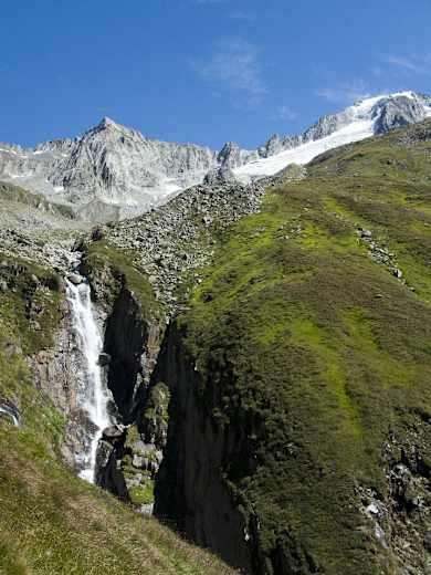 Auf etwa 2.200 m Höhe führt der Weg am eindrucksvollen Wasserfall vorbei und schwingt sich weiter in Kehren zum Furtschaglhaus, 2.293 m auf. Gleich hinter dem Unterkunftshaus verlässt man die Route Richtung Möseler nach links, um der Beschilderung zur Berliner Hütte zu folgen. Der Weg führt nun ein wenig den Talboden entlang und knickt dann links ab. Später dreht er wieder nach Osten ab und führt in moderater Steigung am freien Hang mit beeindruckenden Ausblicken auf die höchsten Gipfel der Zillertaler Alpen weiter hinauf.