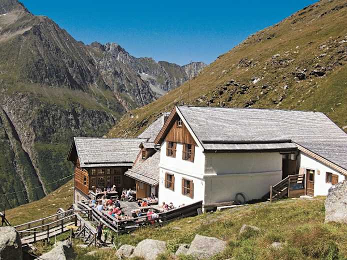 Neben der grandiosen Rundschau auf die eindrucksvolle Zillertaler Gletscherwelt, vornehmlich zur markanten Hochfeiler-Nordwand, zum Großen Möseler, zu den Hornspitzen und zum makellosen Schwarzenstein, sorgt das Schönbichler Horn nicht nur für die Seele, sondern auch für den Leib, denn in zwei Berghütten können wir auf der langen Tour gemütlich einkehren oder übernachten.