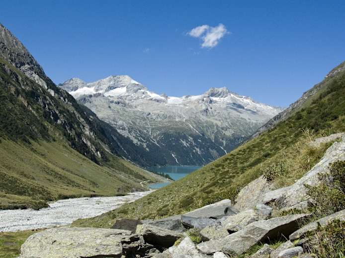 Der schnellere Weg ins Tal verläuft aber nach Norden, schnurstracks zum Wirtshaus Alpenrose hinunter, wo wir ein Sträßchen erreichen, das durch den Zemmgrund bis zum Gasthaus Breitlahner hinausläuft. Wenn wir zum Ausgangspunkt zurückwollen, können wir mit dem Linienbus wieder zum Schlegeisspeicher hinauffahren. Für die Abstiegsvariante muss man mit mindestens fünf Stunden rechnen, kommt also dann kaum um eine Übernachtung herum.