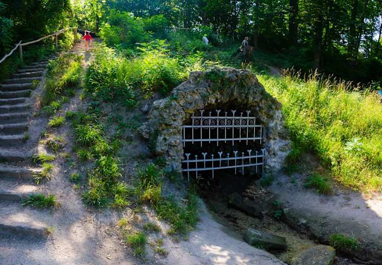 die Anlage durchqueren können. Am Pförtnerhaus (Relief "Steinerner Torwächter" und schwere Torflügel) verlassen wir das Schlossgelände.