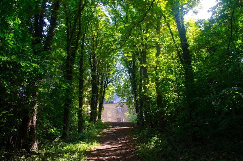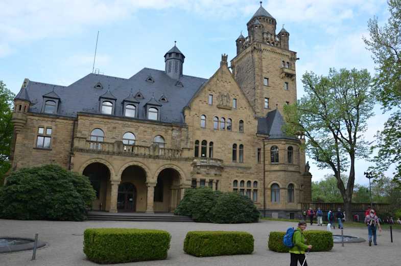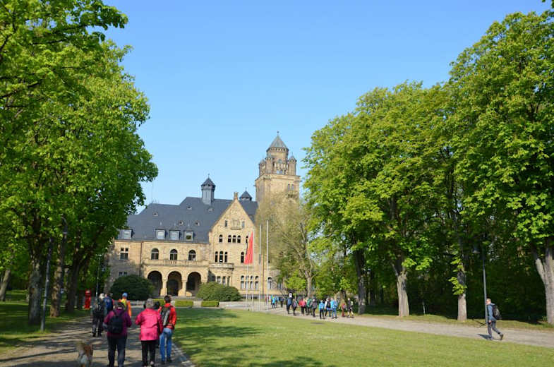 Die neue Wegführung führt nun durch den Ober-Olmer Wald zu den renaturierten Flächen mit Holzstegen und moorähnliches Gelände, einem Frieden-Gedenkkreuz und einem Aussichtspunkt in die Finthener Obstfelder. Wir überqueren die Flugplatzstraße in Finthen und setzen die Wanderung durch die Obstfelder fort. Bald tauchen wir in den Lennebergwald ein (ca. 630 ha Fläche, auch Gonsenheimer oder Budenheimer Wald genannt). Dies ist ein ganz spezieller Wald, mit einem sandigen Boden, eine der grünen Lungen von Mainz. Vorbei an einigen angelegten Weiher, die sich zu Biotopen entwickelt haben, wandern wir bis in die Nähe der "Rheingoldruhe". Dort stoßen wir auf den mit einem "R" markierten Rheinhöhenweg und unterqueren die A 60. Bald treffen wir auf eine Hinweistafel zum "Grünen Haus" (Ausstellung von Tier- präparaten und Verkauf von Wildprodukten). Kurz darauf geht es bergauf und wir treffen auf eine Allee, die ehemalige Schlossauffahrt von Heidesheim aus. Kurz darauf stehen wir vor dem Schloss Waldthausen (1909 von Martin Wilhelm Freiherr von Waldthausen, Sohn einer begüterten Industriellenfamilie, erbaut). Heute Sitz der Sparkassenakademie. Der Park des Schlossgeländes ist öffentlich zugänglich, so dass wir