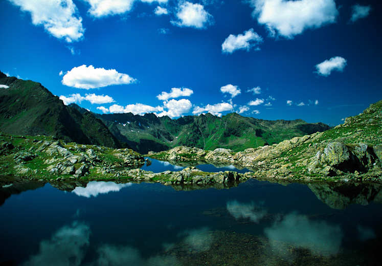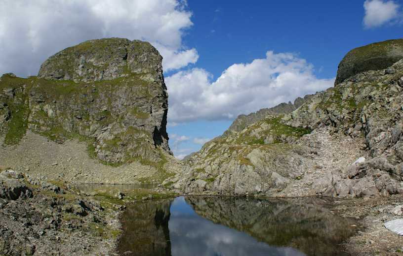 Nun ist ca. die Hälfte des Weges geschafft und es beginnt der relativ steile, aber kurze Abstieg in den Klafferkessel. Die knallgrünen Moosmatten und die übrige Vegetation versprühen eine eiszeitliche Aura und erinnern ein wenig an eine Tundralandschaft. Zwischen kleineren und größeren Seen verläuft der Weg nun fast eben zur Unteren Klafferscharte, wo man die hochalpine Seenplatte hinter sich lässt und den Abstieg zur Preintalerhütte in Angriff nimmt. Zuvor bietet allerdings noch die markante Felsformation des Greifensteins (2.397 m) mit dem davorliegenden See ein schönes Fotomotiv. Von der Klafferscharte geht es anfangs recht steil bergab durch das Innere Lämmerkar. Zuerst am Hang entlang in Richtung Nordosten, biegt der Weg bald in der unteren Hälfte des Kares in Richtung Osten ins Äußere Lämmerkar.