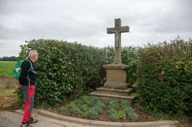 In Ebersheim geht es zunächst nach Norden bis zu einem weiteren Feldkreuz (zur Erinnerung an das Fest Kreuzerhöhung, 1891 errichtet). Auf der Anhöhe erreichen wir die höchste Erhebung des Mainzer Stadtgebietes. Die Aussicht ist dementsprechend bis zum Donnersberg, dem Soonwald, dem Rheingau und Taunus sowie der Skyline von Frankfurt. Dann geht es an einem schönen Rastplatz mit Infotafel vorbei ins Heilbachtal. Am Bach entlang kommen wir nach Klein-Winternheim zum Andreasplatz mit der Gemeindeverwaltung und der kath. Pfarrkirche St. Andreas. Davor steht eine Bronzestatue ihres Namenspatrons.