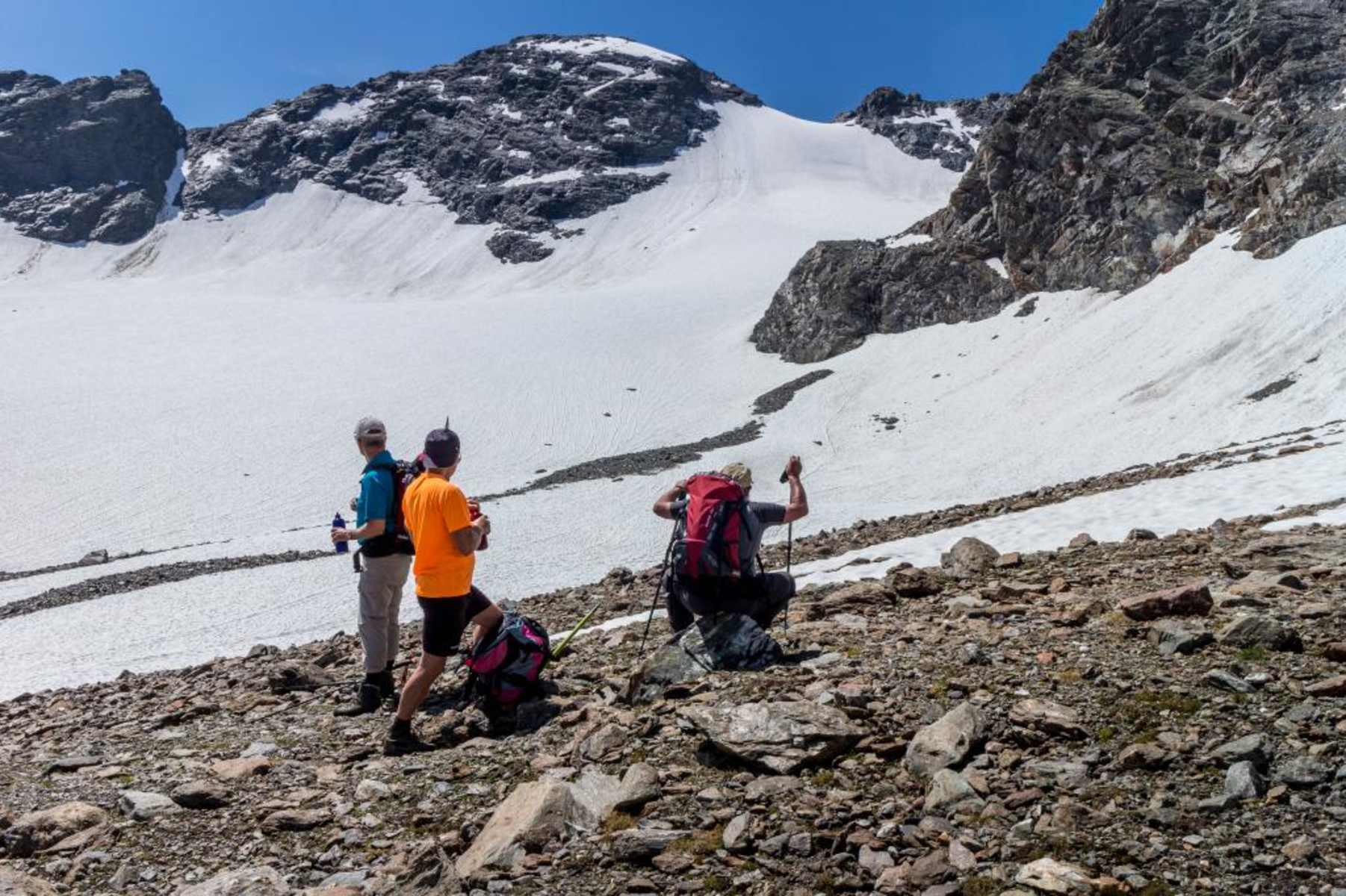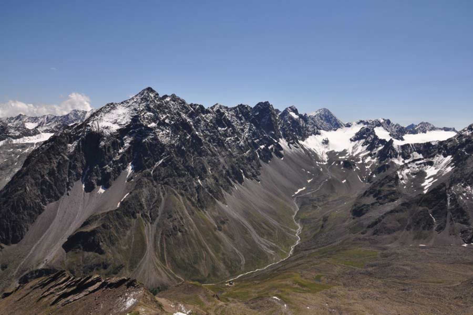 The Arial in the rear Gleirschtal is characterized by the extensive vegetation with old side moraine of the retired Gleirsch glacier. The farther you enter the valley are the block fields. Up to the lakes we follow the marked "circular route". The, usually snow-capped, horse-cart road is clearly visible from here. It is the lowest point of the prolonged degree of the mighty pit wall. The trail from the lakes is now marked with stone men. Over the block fields it goes to the edge of the ice layers covered by debris. In early summer the area is usually provided with a good old snow cover, which facilitates the advance. About the remaining fields to the foot of the ridge with some bends we get up well on the horse cart road. In the late summer crampons are necessary.