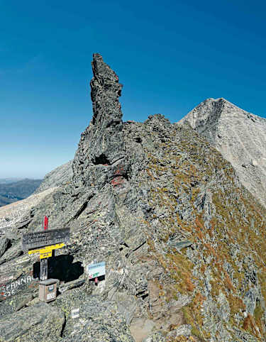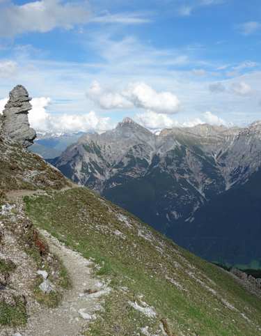 Der Steig leitet an der steilen NW-Seite der Neunerspitze empor, zwei Stellen sind mit einer Kette zum Anhalten gesichert. In 10 min erreicht man das dritte Jöchl (2.200 m), mit einem „Steinmannl“ markiert. Westlich (rechts) geht’s hinauf zur Neunerspitze, 2.285 m, dahinter erblickt man die Mohrenköpfe, nördlich der Viggarspitze.