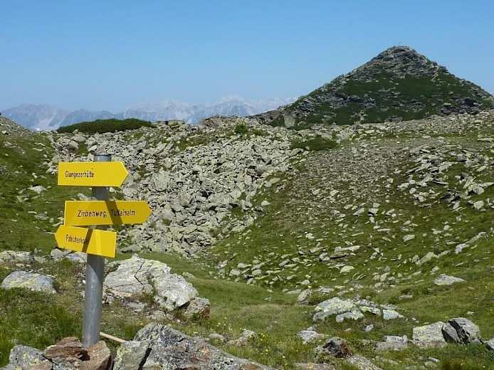 Durch Latschen und Legföhren hindurch und einem Meer von Nebelbeeren steigt man auf dem schmalen Steiglein zum ersten Sattele, (ca. 20 min., ca. 2.100 m), hier am zweiten Jöchl steht eine lange Skiroutenstange aus der Zeit, als man noch vom Patscherkofel her mit Skiern zum Bärenbader Jöchl, weiter ins Frauental und zur Glungezerhütte aufgestiegen ist.