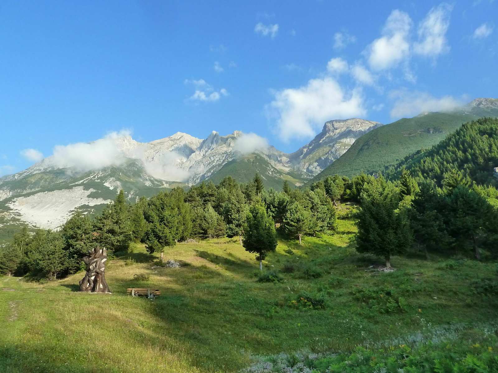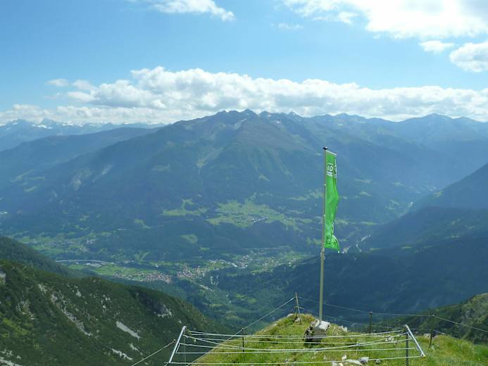 Vom Parkplatz in Grins auf rund 1.070 m Höhe folgt man anfangs der Forststraße mit der Nummer 634 aufwärts. Der Weg geht bald in einen Wiesenweg über und man genießt die schönen und bunten Almwiesen. Links haltend, kommt man an einer seltsam anmutenden, rostigen Skulptur vorbei.