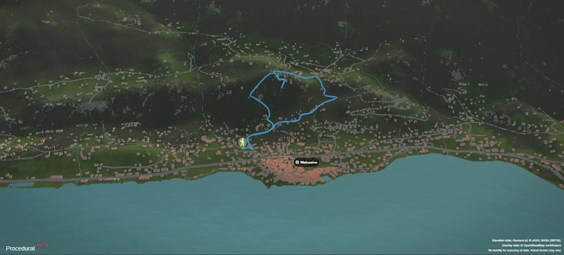 Ausgangspunkt der Route ist bei der Talstation Malcésine (85 m). Von hier aus zur Via S. Antonio und rechtshaltend steil bergauf. Bei der Wegmarkierung um 135 m biegt man links ab. Nun wandert man auf einer steilen Betonstraße bergauf, links vorbei beim letzten Haus und auf einem breiten, mit Rundsteinen gepflastertem Weg durch Olivenheine queren.