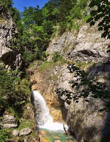 Dort steigt man nun in einer Linkskurve bergan, während man nach rechts auf den Panoramaweg abbiegt. Wer lieber auf der Forststraße wandert, kann ihrem Verlauf bis zum Binsalm-Niederleger folgen. Der Panoramaweg lädt immer zum Blick auf die spektakuläre Gebirgslandschaft ein. Mit einem Fernglas lassen sich oft Gämsen beobachten, auch die alpine Flora ist hier sehr artenreich.