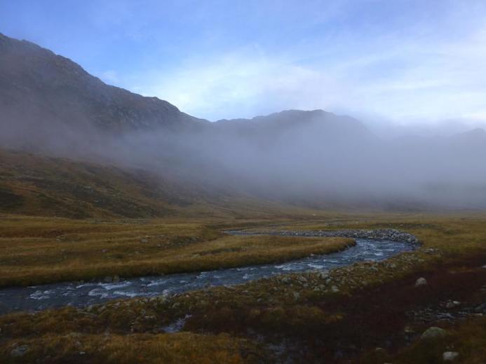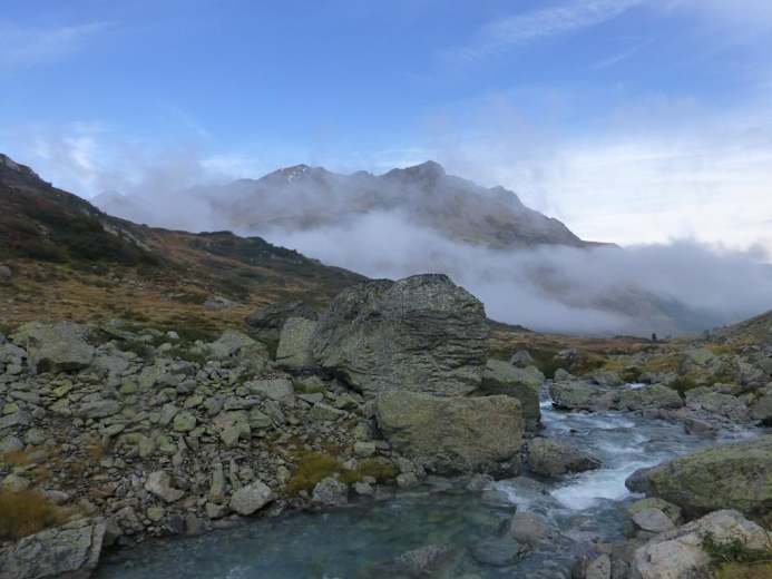 Am Ende der Hochfläche wird der Weg etwas steiler und an einigen Stellen ist er etwas ausgewaschen und erodiert. Oftmals ist der Verlauf nicht ganz klar, aber hier ist es sehr wichtig, keine Abkürzung zu nehmen und den Markierungen zu folgen. Der Weg führt vom Albonabach weg in Richtung Osten (also nach rechts) bis zu einer Brücke, die über die Rosanna leitet. Der schmale Weg geht über in einen breiteren Fahrweg, der stetig abwärts führt. Alle Abzweigungen, die in andere Täler führen, bitte ignorieren.