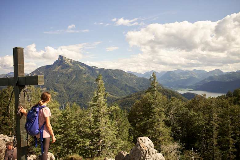Über letzte Felsen erreicht man schließlich das Gipfelkreuz und genießt ein grandioses Panorama auf den Mondsee.
