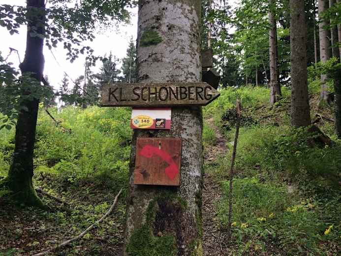 Die Tour beginnt nach dem Gasthaus Hoisn in Gmunden am Ende der Traunseestraße. Der Zustieg erfolgt über den Weg, der auch auf den Traunstein führt. Über eine breite Forststraße geht es zunächst 20 Minuten bergauf, immer am See entlang. Nach den beiden (unbeleuchteten) Tunnels befindet sich links die Abzweigung zum Naturfreunde-Steig auf den Traunstein, man bleibt jedoch noch auf der Forststraße und geht noch ca. 10 Minuten gerade aus. Der Zustieg zum Kleinen Schönberg ist mit einer Holztafel gekennzeichnet. Von dort weg geht es ziemlich steil und stufig in 45 Minuten hoch zum Gipfel.