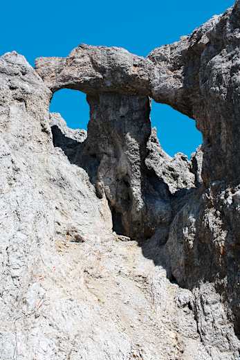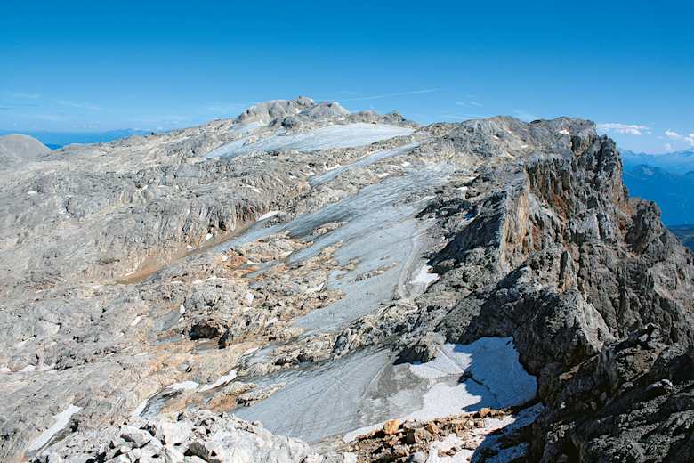 Durch das rechte Loch führt der Anstieg auf die Kammhöhe, 2.730 m, die den Blick freigibt: nach Norden auf eine Landschaft, die dem Steinernen Meer ähnelt, und nach Osten über die Gletscherfläche der Übergossenen Alm zum Gipfel des Hochkönigs mit dem Matrashaus. Bis dorthin sind es allerdings noch 1,5 Stunden Gehzeit über die geröllbedeckten Gletscherschliffplatten am Kamm.