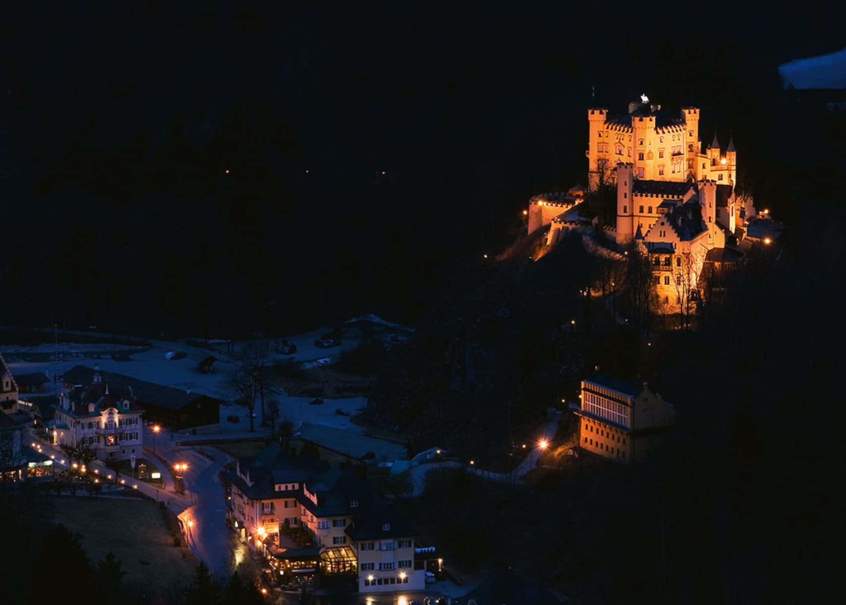 Das illuminierte Schloss Hohenschwangau, gesehen vom Aussichtspunkt »Jugend« (März, 18.55 Uhr, 3,2 sec, f9, F75 mm). Foto: Joachim Simon