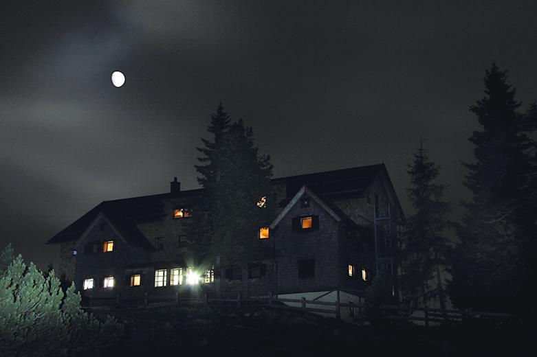 Dann folgen wir im Licht der Stirnlampen dem nicht zu verfehlenden Weg bis an den Gschöllkopf und sehen bald darauf die erleuchteten Fenster der Erfurter Hütte. Der Mond steht am Himmel.