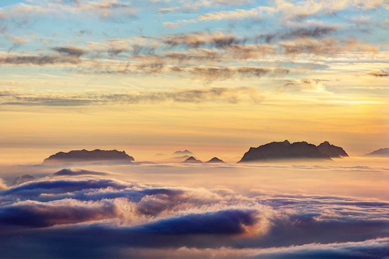 Morgens auf der Hochiss: Zahmer und Wilder Kaiser erscheinen wie Inseln im Wolkenmeer (Oktober, 7.18 Uhr, 1/20 sec, f13, F68 mm). Foto: Joachim Simon Bildergalerie (3)