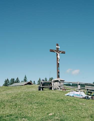 Nach einem kleinen Gegenanstieg weist rechts ein Wegweiser zum sog. Heimkehrerkreuz (1.500 m). Es steht in einer versteckten Waldlichtung am Mittagskopf, 1.543 m. (Der Weg dorthin führt abkürzend zur Kala-Alm hinunter.)