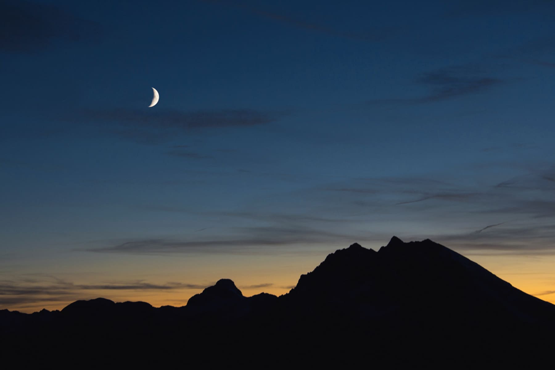 Zwischen den Felsen im Hintergrund beginnt der Mannlgrat mit einem interessanten Klettersteig hinauf zum Hohen Göll. Die Sicht reicht vom Untersbergmassiv über die Salzachebene bis hin zum Dachsteingebirge und südwestlich von Hohem Göll und Hohem Brett ins Steinerne Meer. Dann folgen Watzmann, Hochkalter und die anderen markanten Berchtesgadener Gipfel. Sogar die Erhebungen des Bayerischen Waldes und des Böhmerwaldes kann man bei klarer Sicht erkennen. Es weht ein warmer Föhnwind. Er erleichtert das Warten auf das Versinken der Sonne. Der spät aufgegangene Mond ermöglicht schließlich noch ein letztes stimmungsvolles Bild.