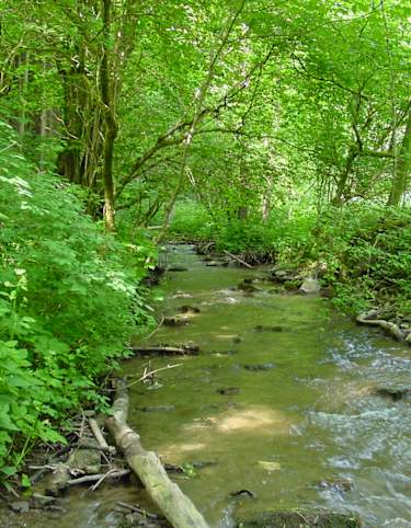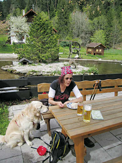 Nach ausgiebiger Rast in der großartigen Gartenwirtschaft wenden wir uns wieder dem Bach zu und gehen vor ihm rechts, den Weg unter einer Stromleitung weiter. Dieser leitet bald in den Wald.