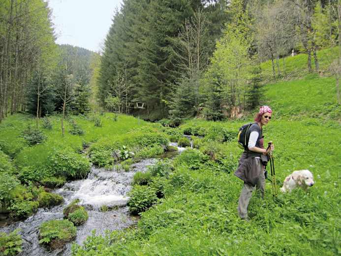 Kurz nach einem Anwesen (einem ehemaligen Gasthaus) gehen wir halb links zum Kropfbach und dort weglos flussauf über die Wiese, kurzerhand zum Jägerhof Kropfmühle (530 m) weiter.
