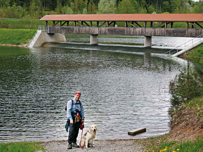 Nach etwa einem Kilometer ist links im Wald eine kleine Holzhütte, die zur Rast einlädt. Kurz danach erreichen wir die Holzbrücke (553 m), die über den See gebaut ist und die Vorsperre von der Hauptsperre trennt. Die Vor- und Hauptsperre haben eine stolze Länge von fast 3 Kilometern und eine Wasserfläche von über 450.000 Quadratmetern. Die tiefste Stelle misst 30 Meter und das Fassungsvermögen beträgt 5.000.000 Kubikmeter