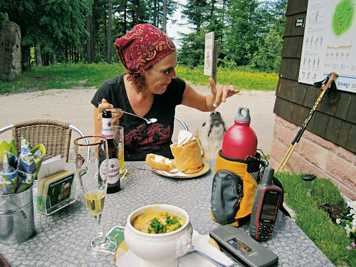 An dem lauschigen Plätzchen lädt die Küche des Wanderheims (Windbeutel!) und der Aussichtsturm förmlich zum Verweilen ein. Gönnen Sie sich mit Ihrem Hund eine kleine Rast. Vier Tafeln informieren auf dem Turm in allen Himmelsrichtungen und kilometergenau über die Namen der umliegenden Berge und Siedlungen.
