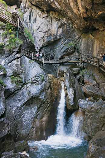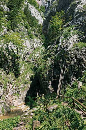 Nun durch die Klamm empor, die zuerst eher breit ist. Senkrechte Felsmauern und Wasserfälle dominieren hier das Bild. Die Schlucht weist eine Höhe von 350 m und eine Länge von 1.300 m auf und wurde bereits am Beginn des 20. Jh. vom Grazer Alpenclub mit einer Steiganlage begehbar gemacht. Heute wird die Anlage, die aus 109 Brücken und 51 Leitern besteht, von der ÖAV-Sektion Mixnitz instand gehalten.
