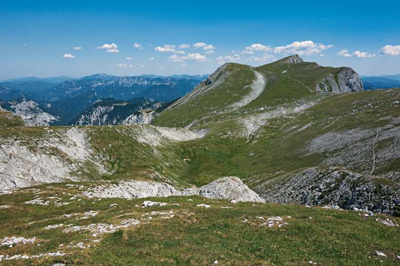 Halb rechts unser nächstes Gipfelziel, die Hochweichsel. Noch etwa 700 m auf dem Staritzen-Höhenweg, dann bei einer Wegkreuzung rechts auf den ebenfalls rot markierten Steig Richtung Hochweichsel. Über die Niedere Scharte auf den Südwestrücken der Hochweichsel und über Grasmatten die letzten 120 Hm zum Gipfel.