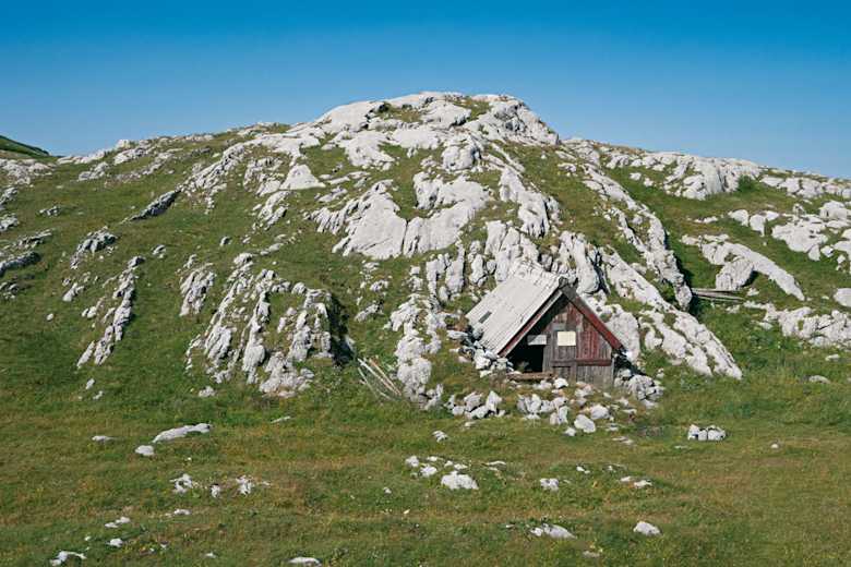 Weiter zur Hochfläche der Mitteralm. Über satte Almwiesenböden zur Unterstandshütte. Über einen Rücken in den Zlackensattel hinunter, hier bei einer Wegkreuzung nach links Richtung Seewiesen.