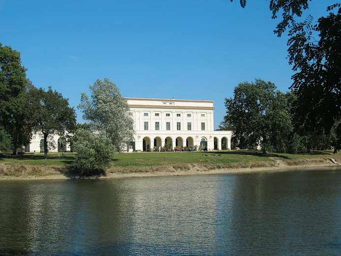10 Min. danach queren wir eine hölzerne Brücke und stoßen auf den grün markierten, asphaltierten Zufahrtsweg zum Schloss Pohansko, das wir bereits rechts am Ende der Lichtung erblicken.