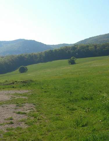 Nach wenigen Minuten, der Markierung schräg rechts in einen Hohlweg folgend, zu einem Zaun, den man auf einer Eisenleiter übersteigen kann. An einer Warntafel rechts vorbei zu einer Forststraße, parallel zu einem Graben bergauf.