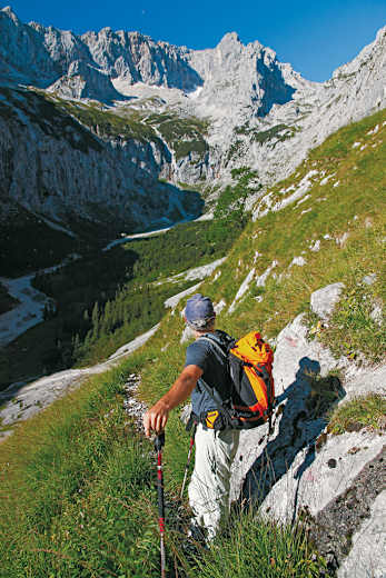 Dieser windet sich nun großzügig talwärts und wartet zwischendrin an einer Art Rampe mit einer klettersteigähnlichen Passage auf. In felsdurchsetztem Gelände geht es schließlich gemeinsam mit der Zugspitzroute zum Höllentalanger hinab. Sämtliche Schwierigkeiten liegen jetzt hinter uns – so bummeln wir gemütlich zur Höllentalangerhütte hinaus und dürfen die verdiente Einkehr genießen. Zum Finale wartet nochmals die Höllentalklamm oder alternativ die Umgehung auf dem Stangensteig, falls man etwas variieren möchte.